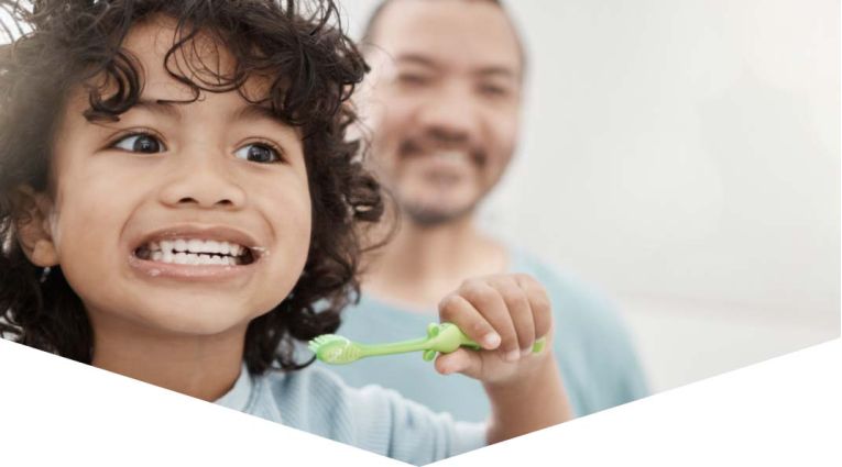 Parents should show their children how to clean each area of the mouth using circular strokes on each tooth surface for a total of two minutes – using a timer can help here, so the child can see how much longer they should brush for. This will also help to show the child that their parent brushes their teeth too, and help to create a routine together.[ii]